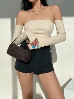 Women’s Summer Fall Tops and Blouse Solid Color Strapless Tube Crop Top with Long Sleeves Casual Fashion Shirts Streetwear