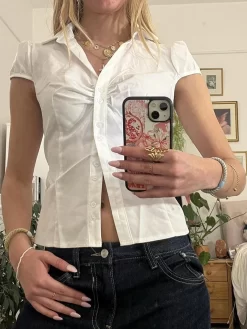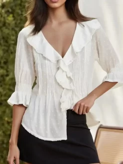 Women’s Button Down Shirts Stylish Ruffled Trim Crew Neck Short Sleeve Slim Fit Tops Casual Y2K Gothic Blouse for Summer