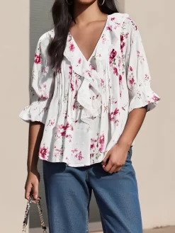 Women’s Floral Print Tops 3/4 Sleeve Front Button V-Neck Casual Elegant Loose Blouse Summer Fall Shirts