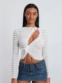 Women Blouse 2 Piece Sets Lace Sheer Long Sleeve Shrug with Cut Out Halter Bra 2024 Summer Fall Beach Club Sexy Shirts