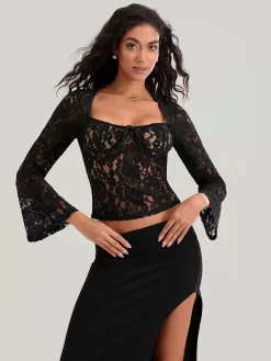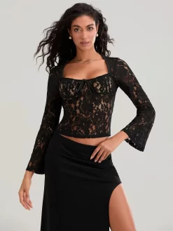 Women Lace Tops and Blouses Long Sleeve Square Neck Corset Top Summer Fall See Through Sexy Elegant Shirts Female