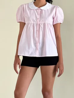Women Blouses Short Sleeve Doll Collar Button-down Shirts Summer Striped Elegant Tops Streetwear