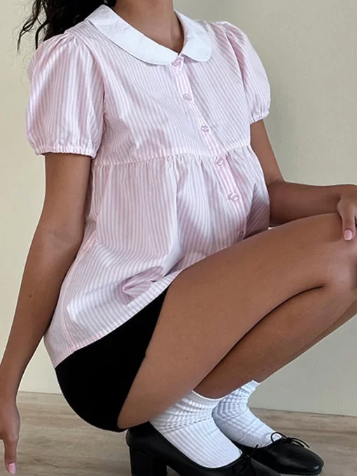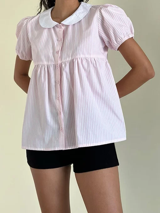 Women T-shirt, Elegant Short Sleeve Doll Collar Button-down Summer Striped Tops Streetwear