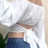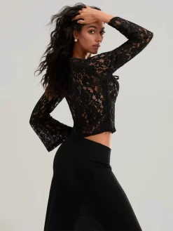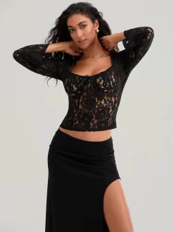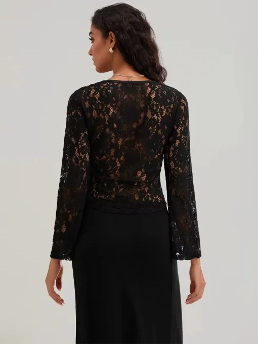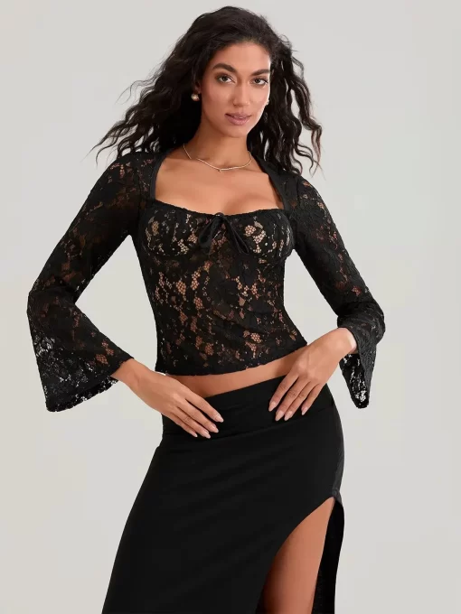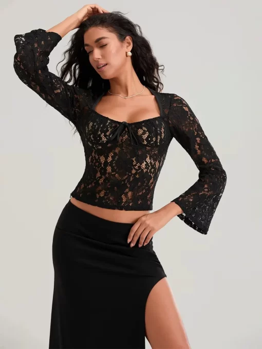 Women’s Lace Floral Sheer Tops Long Sleeve Sweetheart Neck Front Bowknot Cropped Blouse Clubwear