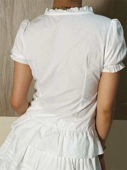 Women’s Button Down Blouse Slim Fit Stylish Solid Ruffled Trim Crew Neck Short Sleeve Tops for Summer