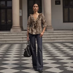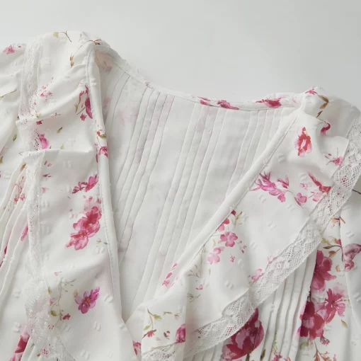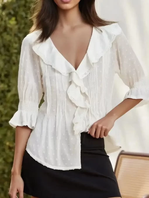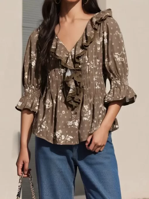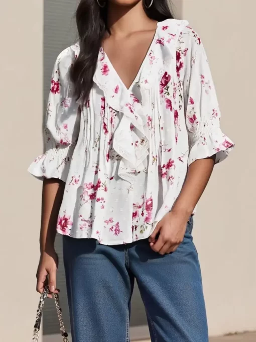 Women’s Ruffled V Neck Blouse Loose Fit Solid/Floral Print Button Down Elbow Sleeve Tops Summer Fall Elegant Shirts